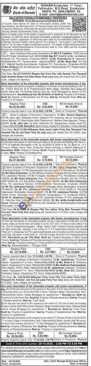 Short description of the immovable property with known encumbrances, if any All that part and parcel of immovable property having a total extent of 9.88 Ares (24.426) Cents) made up of 8.09 Ares (20 Cents) in Sy No. 42/1 and 1.79 Ares (4.426 Cents) in Sy No. 42/2 of Kulasekharamangalam Village, Vaikom Taluk, Kottayam District together with all rights thereunder, standing in the names of (1) PG Lakshmana Panicker Sto Gopala Pillai (2) PL Sreekumar Sio PG Lakshmana Panicker and (3) Anilha Sunil Wio Sunil Kumar, more fully described in Sale Deed no. 1791/2013 dated 02.09.2013 of Thalayolaparambu SRO. Boundaries as per Title Deed: North by: Property belonging to More Ougen Church, South by: Pathway and Properties belonging to Kurukunjiyil Kochola and Valokikottu Ravi; East by: Properties belonging to Puthuparambil Purushan and Kurukenjiyil Kochola West by: Manammelkadavu Chungam Road