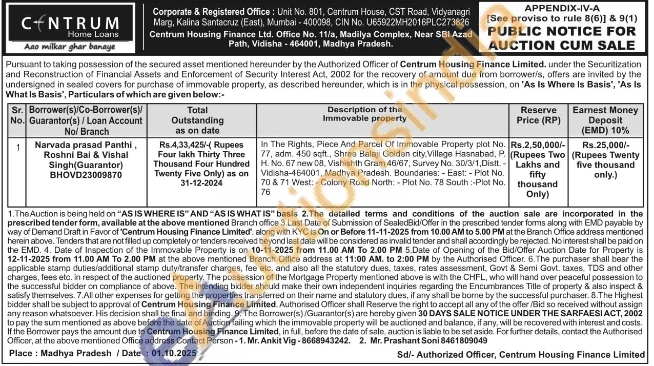 In The Rights, Piece And Parcel Of Immovable Property plot No. 77, adm. 450 sqft., Shree Balaji Golden city, Village Hasnabad, P. H. No. 67 new 08, Vishishth Gram 46/67, Survey No. 30/3/1, Distt. Vidisha-464001, Madhya Pradesh. Boundaries: - East: - Plot No. 70 & 71 West: - Colony Road North: - Plot No. 78 South:-Plot No. 76