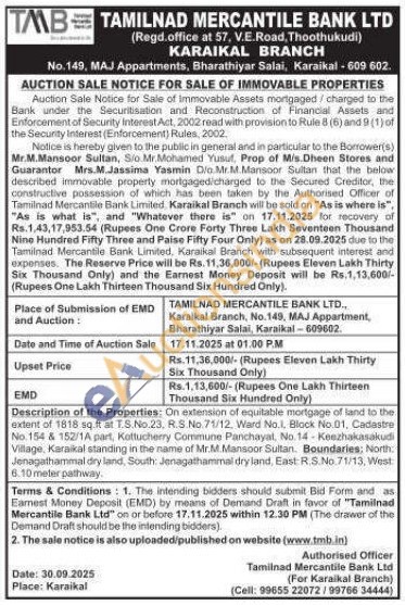 On extension of equitable mortgage of land to the extent of 1818 sq.ft at T.S.No.23, R.S.No. 71/12, Ward No.1 Block No 01, Cadastre No. 154 & 152/1A part, Kattucherry Commune Panchayal, No. 14 Keezhakasakudi Village, Karaikal standing in the name of Mr.M.Mansoor Sultan. Boundaries: North. Jenagathammal dry land, South: Jenagathammal dry land, East: R.S. No. 71/13, West 6.10 meter pathway.