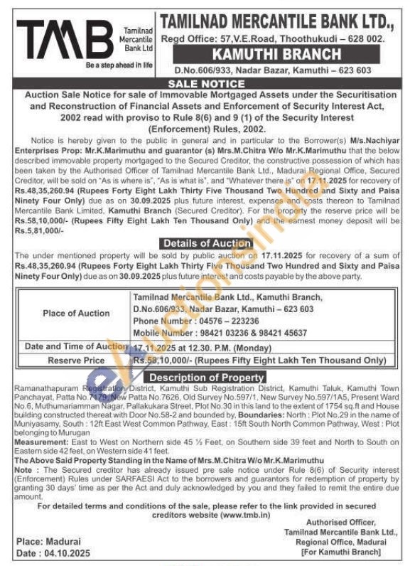 The under mentioned property will be sold by public auction on 17.11.2025 for recovery of a sum of Rs.48,35,260.94 (Rupees Forty Eight Lakh Thirty Five Thousand Two Hundred and Sixty and Paisa Ninety Four Only) due as on 30.09.2025 plus future interest and costs payable by the above party.