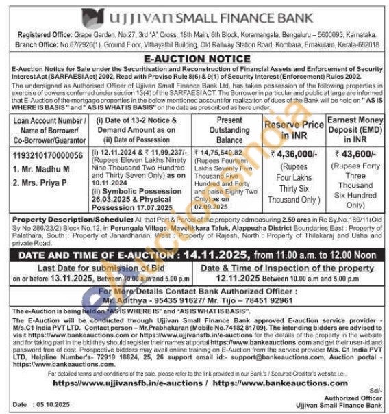 All that Part & Parcel of the property admeasuring 2.59 ares in Re Sy. No. 189/11(Old Sy No 286/23/2) Block No. 12, in Perungala Village, Mavelikkara Taluk, Alappuzha District Boundaries East: Property of Palathara, South Property of Janardhanan, West Property of Rajesh, North Property of Thilakaraj and Usha and private Road