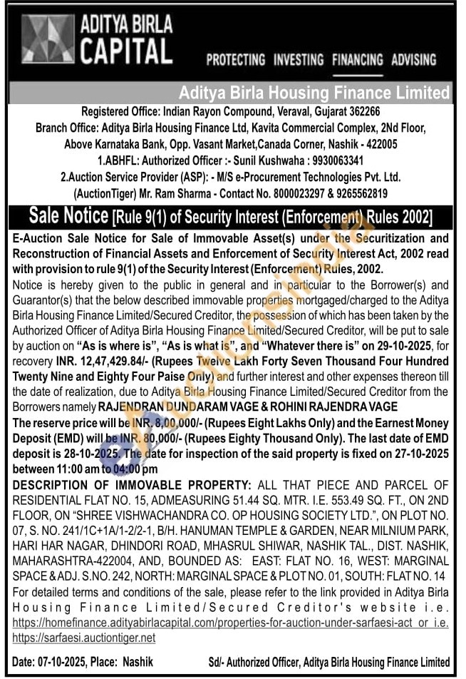 ALL THAT PIECE AND PARCEL OF RESIDENTIAL FLAT NO. 15, ADMEASURING 51.44 SQ. MTR. I.E. 553.49 SQ. FT., ON 2ND FLOOR, ON "SHREE VISHWACHANDRA CO. OP HOUSING SOCIETY LTD.", ON PLOT NO. 07, S. NO. 241/1C+1A/1-2/2-1, B/H. HANUMAN TEMPLE & GARDEN, NEAR MILNIUM PARK, HARI HAR NAGAR, DHINDORI ROAD, MHASRUL SHIWAR, NASHIK TAL., DIST. NASHIK, MAHARASHTRA-422004, AND, BOUNDED AS: EAST: FLAT NO. 16, WEST: MARGINAL SPACE & ADJ. S.NO. 242, NORTH: MARGINAL SPACE & PLOT NO. 01, SOUTH: FLAT NO. 14
