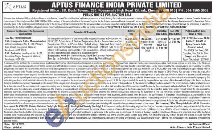 All that piece and parcel of the immovable property situated at Document No: 1935/2002 Schedule No. 2: Tenkasi Registration district, Pavoorchathram Sub Registration Office, VK Pudur Taluk, Vellaki Wilage, Rajapandi Panchayath Ward No. 2. North Street, Natham Sy No. 219 consist 1.23 Cent (536.50.54.10 of land with building bearing No. 1/100 hounded by: of land and building and all other appurtenances attached to the said property,