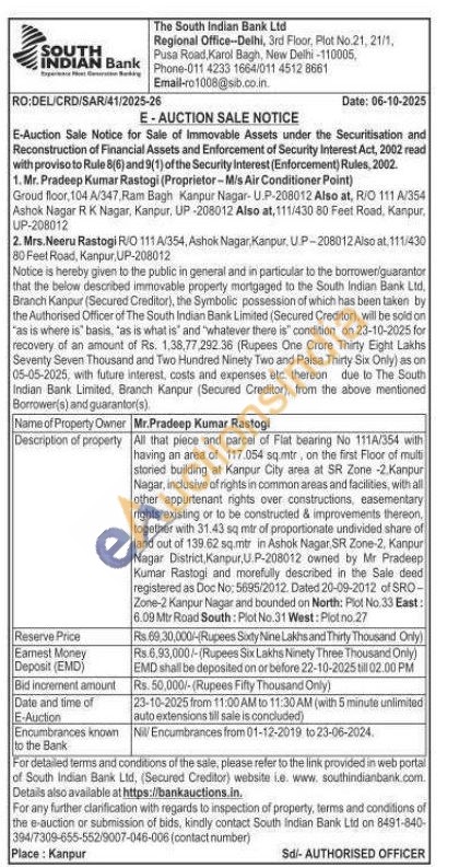 All that plece and parcel of Flat bearing No 111A/354 with having an area of 117.054 sq.mtr, on the first Floor of multi storied building at Kanpur City area at SR Zone -2 Kanpur Nagar, inclusive of rights in common areas and facilities, with all other appurtenant rights over constructions, easementary rights existing or to be constructed & improvements thereon, together with 31.43 sq mtr of proportionate undivided share of land out of 139.62 sq.mtr in Ashok Nagar SR Zone-2, Kanpur Nagar District, Kanpur, U.P-208012 owned by Mr Pradeep Kumar Rastogi and morefully described in the Sale deed registered as Doc No: 5695/2012. Dated 20-09-2012 of SRO-Zone-2 Kanpur Nagar and bounded on North: Plot No.33 East: 6.09 Mtr Road South: Plot No.31 West: Plot no.27