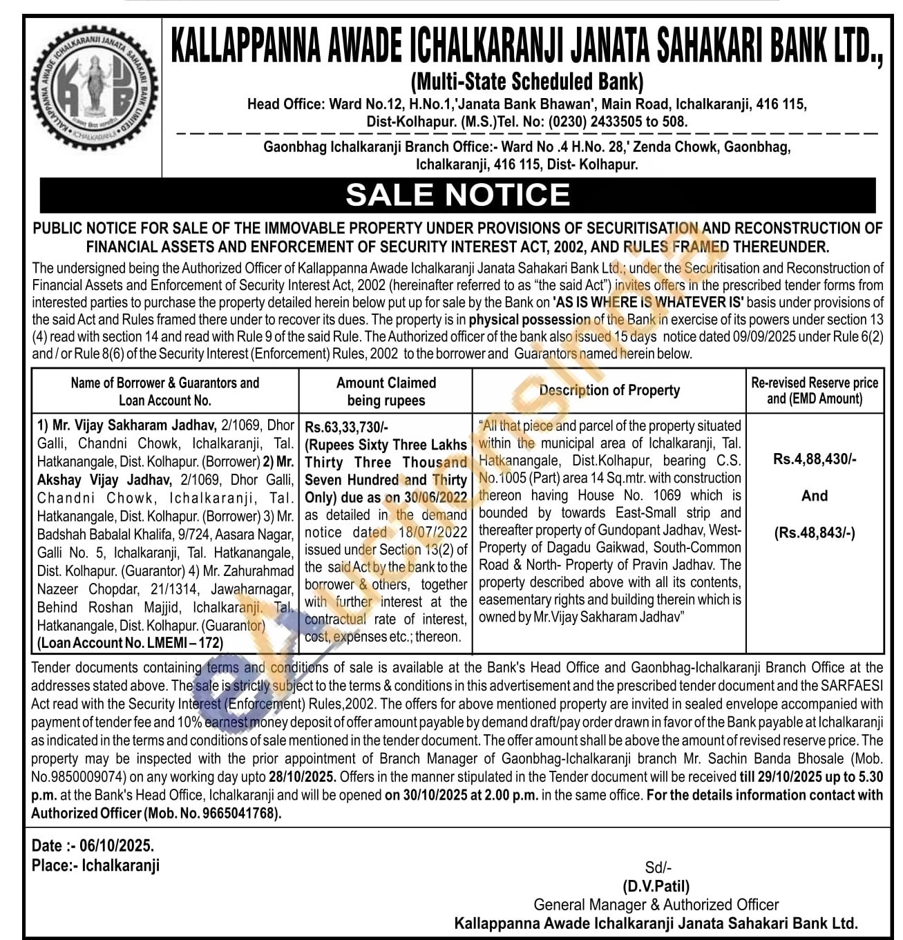 "All that piece and parcel of the property situated within the municipal area of Ichalkaranji, Tal. Hatkanangale, Dist. Kolhapur, bearing C.S. No. 1005 (Part) area 14 Sq.mtr. with construction thereon having House No. 1069 which is bounded by towards East-Small strip and thereafter property of Gundopant Jadhav, West-Property of Dagadu Gaikwad, South-Common Road & North- Property of Pravin Jadhav. The property described above with all its contents, easementary rights and building therein which is owned by Mr. Vijay Sakharam Jadhav"