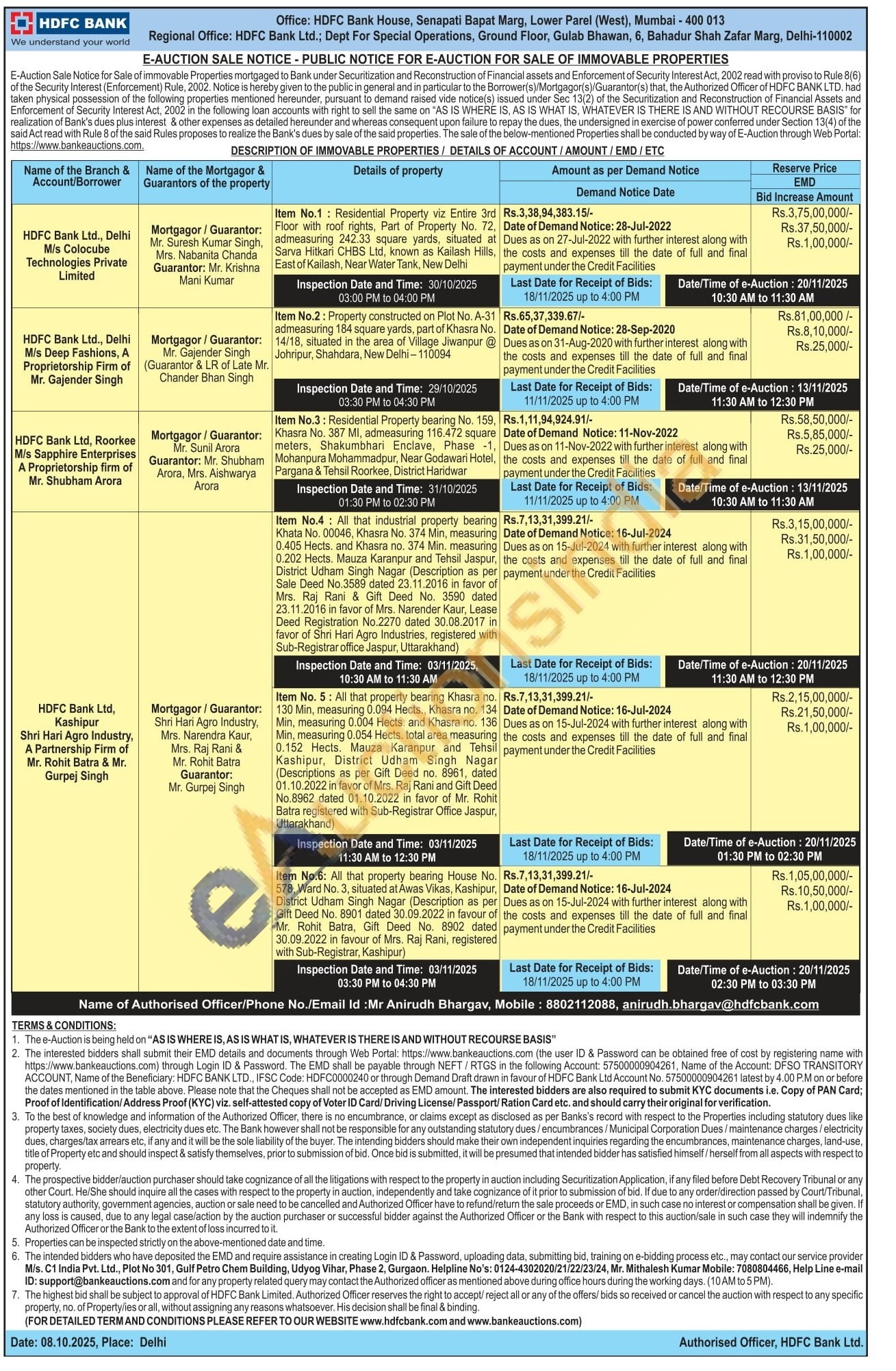 Contact Authorised Officer/Phone No./Email Id:Mr Anirudh Bhargav, Mobile: 8802112088