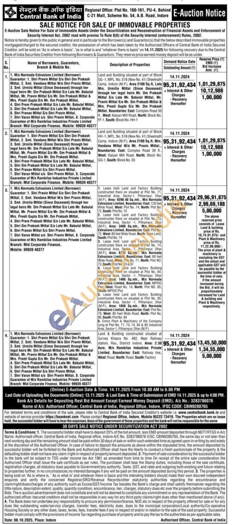 Land & Building constructed situated at Survey Khasra No. 482, Near Railway station, Rau, District Indore, Area: 2.50 Acre, M/s Rambilas Industries Private Limited, Boundaries: East: Railway line, West: Road, North: Road, South: Factory