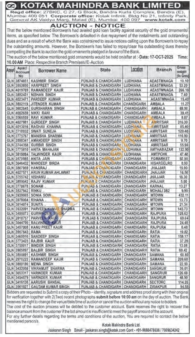 Kotak Mahindra Bank Gold Auctions Auction in Ludhiana