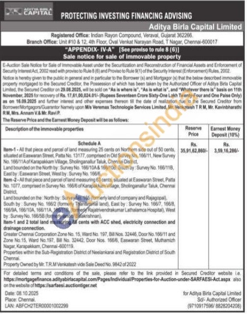 Greater Chennai Corporation Zone No. 15, Ward No. 197, Bill Nos. 32446, Door No. 166/11 and Zone No. 15, Ward No. 197, Bill No. 32442. Door Nos. 166/6, Easwaran Street, Muthamizh Nagar, Karapakkam, Chennai-600119 Properties within the Sub-Registration District of Neelankarai and Registration District of South Chennai