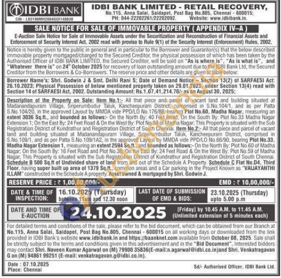 Description of the Property on Sale: Item No.1: All that piece and parcel of vacant land and building situated at Madanandapuram Village, Sriperumbudur Taluk, Kancheepuram District, comprised in S.No.104/1, and as per Patta S.No. 104/20, in the approved Layout by MMDA vide PPD/LO No. 176/88, bearing Plot No.60, Madha Nagar, measuring an extent 3036 Sq.ft., and bounded as follows: On the North By: 40 Feet Road, On the South By: Plot No.33 Madha Nagar Extension 1; On the East By: 24 Feet Road & On the West By: Plot No.59 of Madha Nagar, This Property is situated with the Sub Registration District of Kundrathur and Registration District of South Chennai. Item No.2:- All that piece and parcel of vacant land and building situated at Madanandapuram Village, Sriperumbudur Taluk, Kancheepuram District, comprised in S.No. 109/1, and as per Patta S.No. 109/1A2, in the approved Layout by MMDA vide PPD/LO No 66/90, bearing Plot No.33. Madha Nagar Extension 1, measuring an extent 2594 Sq.ft., and bounded as follows:- On the North By: Plot No 60 of Madha Nagar, On the South By: 16 Feet Road and Plot No.36, On the East By: 24 Feet Road & On the West By. Plat No.59 of Madha Nagar, This Property is situated with the Sub Registration District of Kundrathur and Registration District of South Chennai Schedule B 500 Sq.ft of Undivided share of land from and out of the Schedule A Property. Schedule C Flat No.D4, Third Floor, having super built up area of 1379 Sq.ft., common areas and a Car parking in the Project Known as "VAIJAYANTHI ILLAM constructed in the Schedule A property. Asset owned & mortgaged by Shri. Godwin J