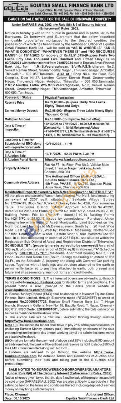 Residential Property owned by Mrs.S.Veeraraghavan: SCHEDULE "A" All that piece and parcel of Vacant land bearing Plot No.3, land measuring an extent of 2257 sq.ft. situated at Sekkadu Village, Survey No. 172/6A1Pt, Block No. 16, Ward F Survey Filed No.42/6, Poonammallee Taluk, Thiruvallur District, CMDA Approval No.D.Dis. No. 42292, dated 25.03.2015 and Planning Permit No. 168/15/F2, dated.25.03.2015, Building Permit File No.170/14/F1, dated. 17.10.14 Building Permit No.142/15/F2 dt.25.03.15 issued by commissioner, Panchayat Union Poonamallee within limits of Avadi Municipality. Land Bounded on the: North by: Land belongs to Mr.Devasagayam, South by 20 Feet Wide Road, East by: Plot No.2, West by: Plot No.4. Measuring: Northern Side :37 feet, Southern Side: 37 feet, Eastern Side: 60 feet, Western Side: 62 feet. In all total measuring an extent of 2257 Sq.ft., and situated within the Registration Sub-District of Avadi and Registration District of Thiruvallur. SCHEDULE "B": (property hereby agreed to be conveyed) An area of 366 sq.ft. of undivided share (out of 2257 sq.ft) in aforesaid "A" Schedule property, SCHEDULE- "C": Residential Apartment bearing No-F3, First Floor, Double bed Room Flat (South Facing) measuring an extent of 763 Sq.Ft., on the Schedule 'A' property and along with Covered Car parking space. Together with all buildings and structure attached to the earth or permanently fastened to anything attached to earth, both present and future and all easementary/mamool rights annexed thereto