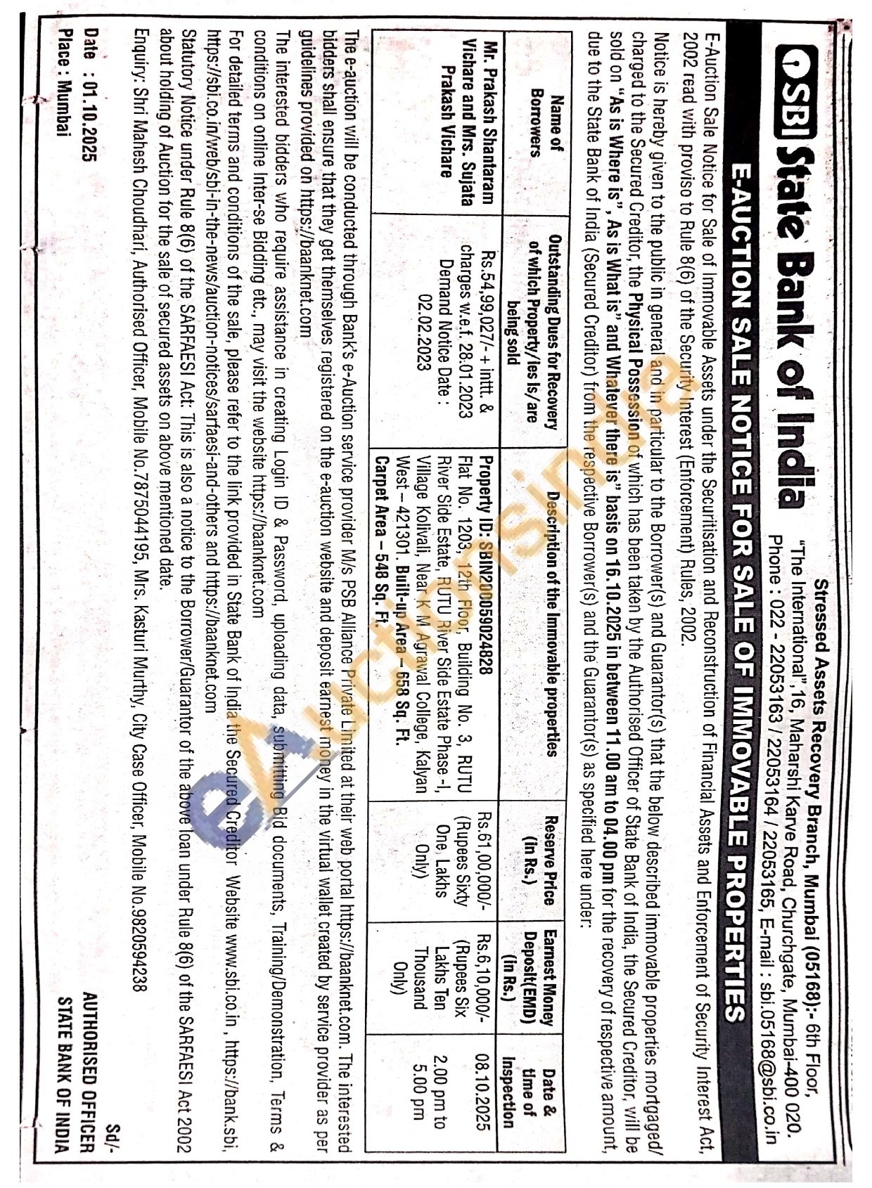Shri Mahesh Choudhari, Authorised Officer, Mobile No.7875044195, Mrs. Kasturi Murthy, City Case Officer, Mobile No.9820594238