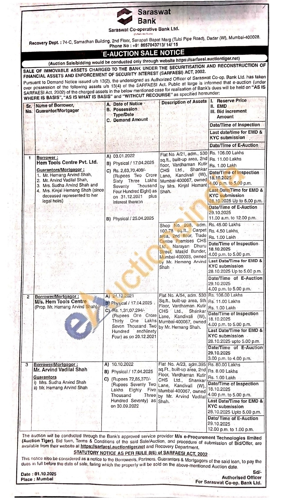 Shop No. 208, adm. 103.78 sq.ft., Carpet area, 2nd floor, Trade Centre Premises CHS Ltd., Narayan Dhuru Street, Masjid Bunder, Mumbai-400003, owned by Mr. Hemang Arvind Shah