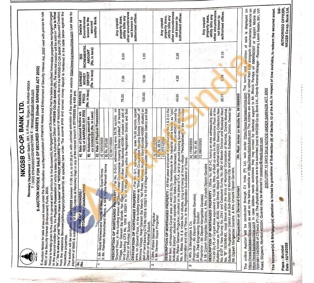 DESCRIPTION OF MORTGAGED PROPERTY: Flat No. E-Gr/1, admeasuring area 55.75 sq.mtrs. on Ground Floor, in the building known as "Silver Anklet Co-operative Housing Society Limited", of Versova Village, Near Ganesh Sai Mandir, Yari Road, Versova, Andheri West-Mumbai-400061 situated on plot of land bearing CTS No. 1262 & 1262/1 to 15 of Village Versova within the Registration District and Sub District of Mumbai Suburb.