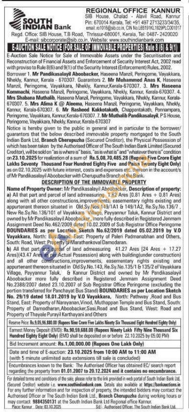 a) All that part and parcel of land admeasuring 1.62 Ares (0.81 Ares + 0.81 Ares) along with all other constructions, improvements, easementary rights existing and appurtenant thereon situated in Old Sy. Nos. 149/1A1 & 149/1A2, Re Sy.No.136/7, New Re. Sy.No. 136/101 of Vayakkara Village, Payyannur Taluk, Kannur District and owned by Mr Pandikasalayil Aboobacker, more fully described in Registered Jenmam Assignment Deed No.462/2009 dated 10.02.2009 of Sub Registrar Office Peringame BOUNDARIES as per Location Sketch No.62/2019 dated 05.02.2019 by V.O Vayakkara, North: Bus Stand, East: Property of Paleri Padmanabhan and Others, South: Road, West: Property of Marathankoval Damodaran.