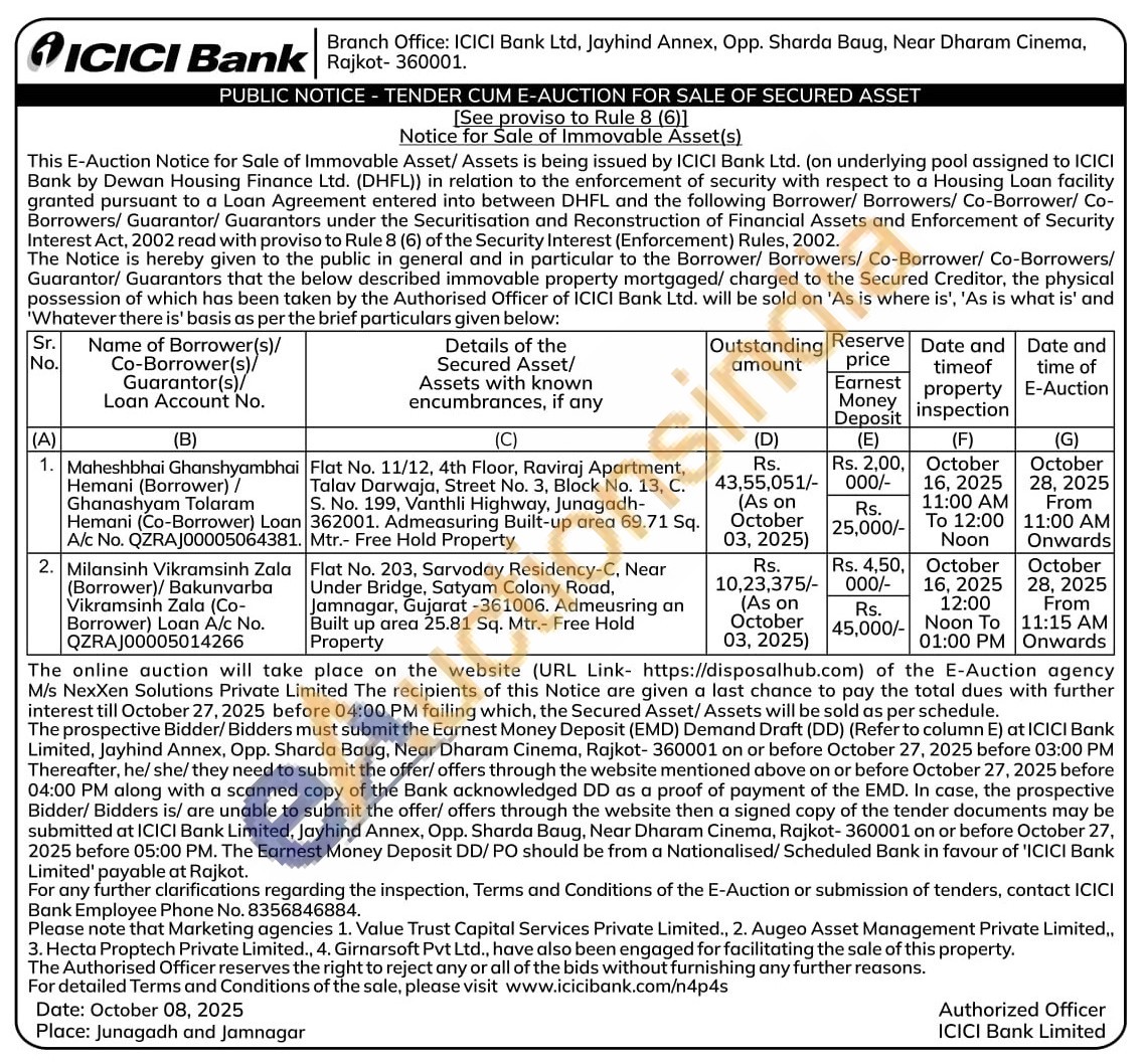 Flat No. 203, Sarvoday Residency-C, Near Under Bridge, Satyam Colony Road, Jamnagar, Gujarat -361006. Admeusring an Built up area 25.81 Sq. Mtr.- Free Hold Property