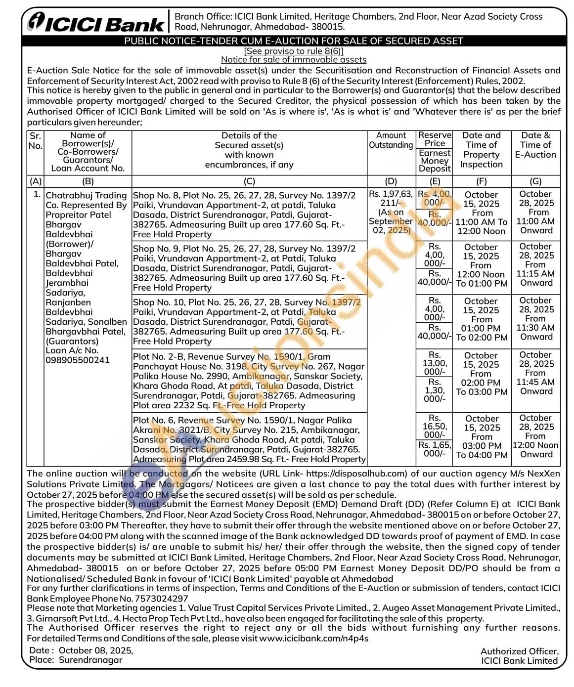 Shop No. 9, Plot No. 25, 26, 27, 28, Survey No. 1397/2 Paiki, Vrundavan Appartment-2, at Patdi, Taluka Dasada, District Surendranagar, Patdi, Gujarat-382765. Admeasuring Built up area 177.60 Sq. Ft.-Free Hold Property
