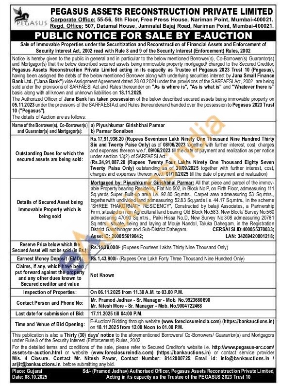 All that piece and parcel of the immov-able Property bearing Residency Flat No.502, in Block No.P, on Firth Floor, admeasuring 111 Sq.yards Super Built-up area i.e. 92.80 Sq.mtrs., Carpet area admeasuring 53 Sq.mtrs.. togetherwith undivided land admeasuring 52.83 Sq.yards i.e. 44.17 Sq.mtrs., in the scheme "SHREE THAKORNATH RESIDENCY", Constructed by balaji Associates, a Partnership Firm, situated on non Agricultural land bearing Old Block No.583, New Block/ Survey No.560 admeasuring 47090 Sq.mtrs., Paiki Hissa No.D. New Survey No.308 admeasuring 20761 Sq.mtrs., situate, being and laying at Mouje Nandol, Taluka Dahegam, in the Registration District Gandhinagar and Sub-District Dahegam.