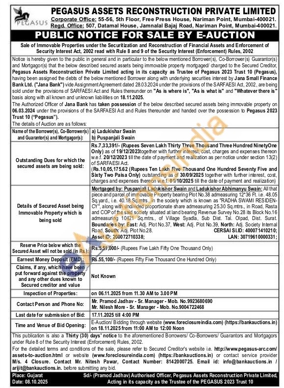 All that piece and parcel of immovable Property bearing Plot No.38 admeasuring 12*36 Ft. ie. 48.05 Sq.yard., i.e. 40.18 Sq.mtrs., in the society which is known as "RADHA SWAMI RESIDEN-CY", along with undivided proportionate share admeasuring 25.30 Sq.mtrs., in Road, Rasta and COP of the said society situated at land bearing Revenue Survey No.28 its Block No.16 admeasuring 10421 Sq.mtrs., of Village Syadia, Sub Dist. Tal. Olpad, Dist. Surat Boundaries by: East: Adj. Plot No.37, West: Adj. Plot No.39, North: Adj. Society Internal Road, South: Adj. Plot No.28.