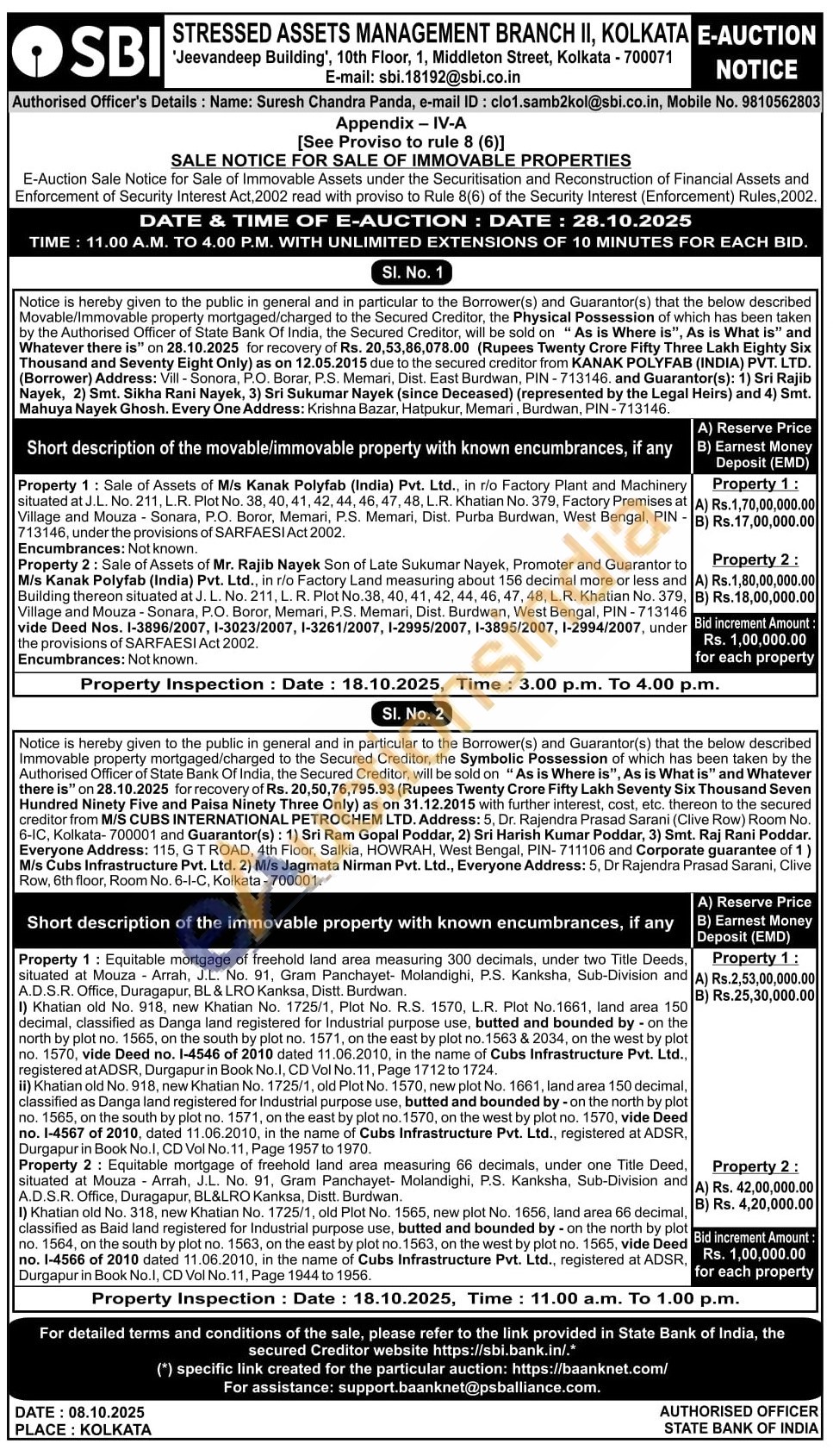 Property 2: Sale of Assets of Mr. Rajib Nayek Son of Late Sukumar Nayek, Promoter and Guarantor to M/s Kanak Polyfab (India) Pvt. Ltd., in r/o Factory Land measuring about 156 decimal more or less and Building thereon situated at J. L. No. 211, L. R. Plot No.38, 40, 41, 42, 44, 46, 47, 48, L.R. Khatian No. 379, Village and Mouza-Sonara, P.O. Boror, Memari, P.S. Memari, Dist. Burdwan, West Bengal, PIN-713146 vide Deed Nos. 1-3896/2007, 1-3023/2007, 1-3261/2007, 1-2995/2007, 1-3895/2007, 1-2994/2007, Under the provisions of SARFAESI Act 2002