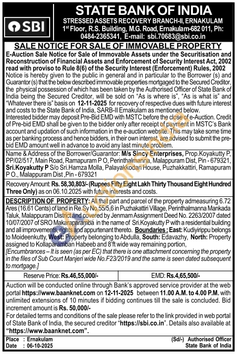 All that part and parcel of the property admeasuring 6.72 Ares (16.61 Cents) of land in Re.Sy No.55/5,6 in Puzhakattiri Village, Perinthalmanna Mankada Taluk, Malappuram District and covered by Jenmam Assignment Deed No. 2263/2007 dated 10/07/2007 of SRO Makaraparamba in the name of Sri. Koyakutty P with a residential building and all improvements, rights and appurtenant thereto. Boundaries: East: Kudiyirippu belongs to Moideenkutty, West: Property belonging to Abdulla, South: Edavazhy, North: Property assigned to Kollaparamban Habeeb and 8'ft wide way remaining portion, [Encumbrances-It is seen (as per EC) that there is one attachment concerning the property in the files of Sub Court Manjeri wide No.F23/2019 and the same is seen dated subsequent to mortgage.]