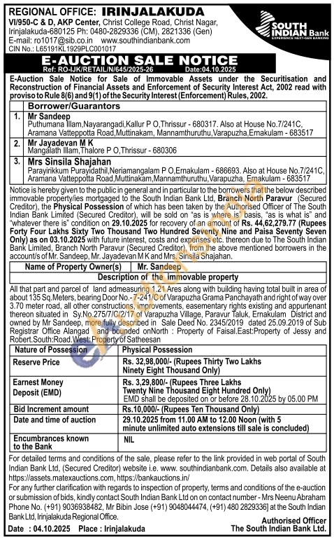 All that part and parcel of land admeasuring 1.21 Ares along with building having total built in area of about 135 Sq.Meters, bearing Door No.-7-241/C of Varapuzha Grama Panchayath and right of way over 3.70 meter road, all other constructions, improvements, easementary rights existing and appurtenant thereon situated in Sy.No.275/7/C/2/17 of Varapuzha Village, Paravur Taluk, Ernakulam District and owned by Mr Sandeep, more fully described in Sale Deed No. 2345/2019 dated 25.09.2019 of Sub Registrar Office Alangad and bounded onNorth Property of Faisal.East:Property of Jessy and Robert. South Road. West: Property of Satheesan