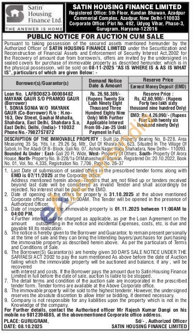 DESCRIPTION OF THE IMMOVABLE PROPERTY: Built Up Property Bearing No. B-228. Area Measuring 35 Sq. Yds. l.e. 29.26 Sq. Mtr., Out Of Khasra No. 623, Situated in The Village Of Saboli, In The Abadi Of B-Block, Gali No. 07, Ashok Nagar, Ilaqa Shahadara, New Delhi-110093. Bounded As Under: East Galil 20 Ft. Wide. West-Property Of Others, South- Property Of Arora House, North Property No. B-228/1a Of Mahaeshwari Bhawan. Registered On: 20.10.2022, Book No. 01, Vol. No. 4,335, Registration No. 7,706, Page No. 26-37