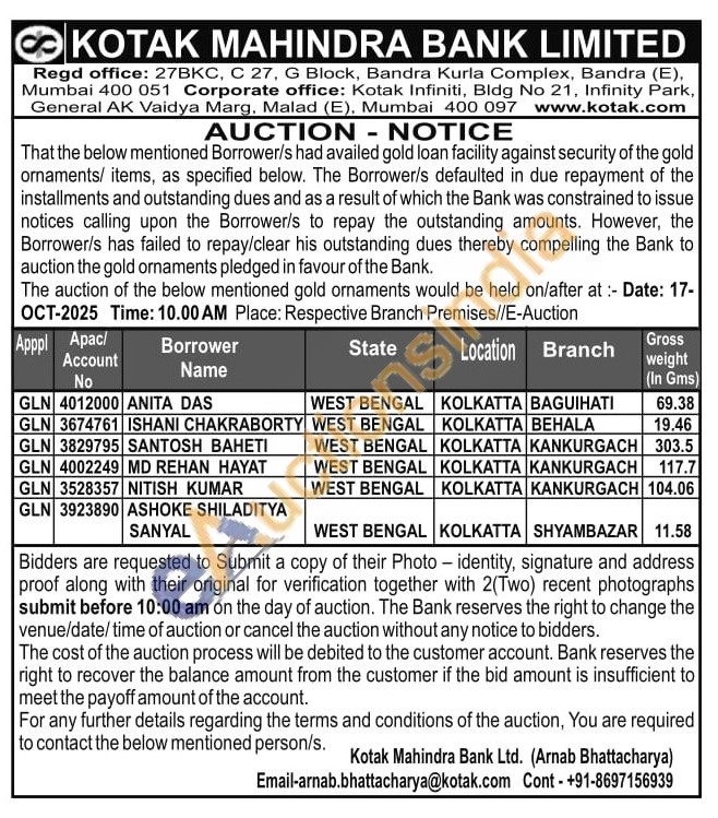 Kotak Mahindra Bank Gold Auctions Auction in Kolkata