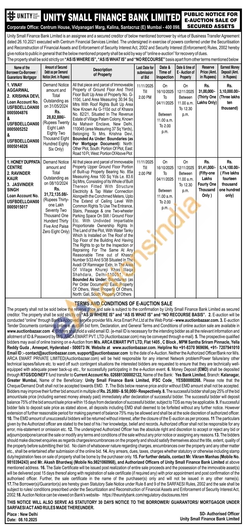 Contact Mr. Vikram Manhas (Mobile No. 9810394243) and Mr. Akash Bhardwaj (Mobile No.9821060968), and Authorized Officers