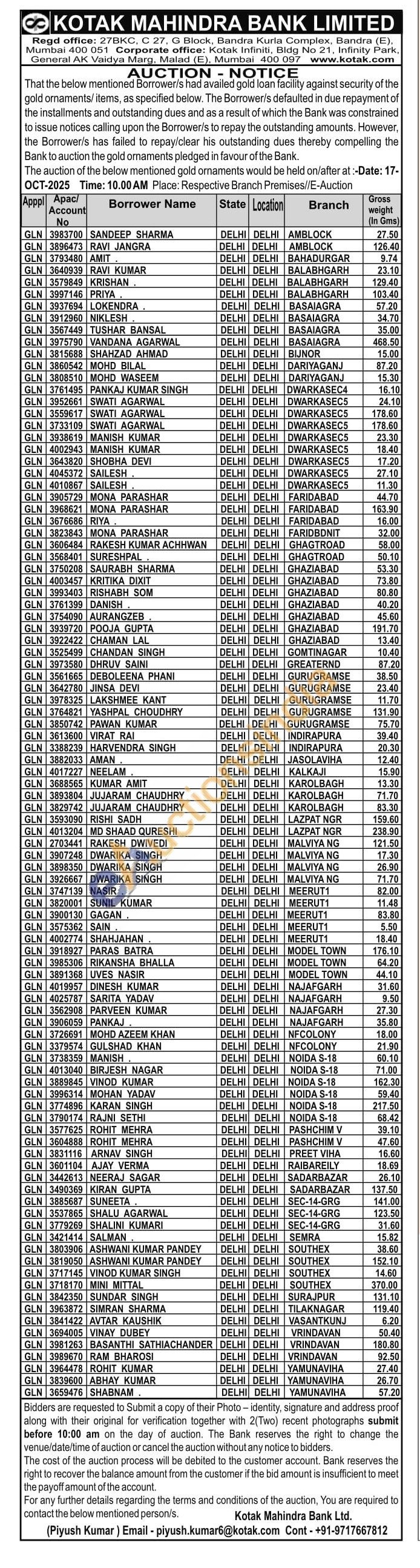 Kotak Mahindra Bank Gold Auctions Auction in New Delhi