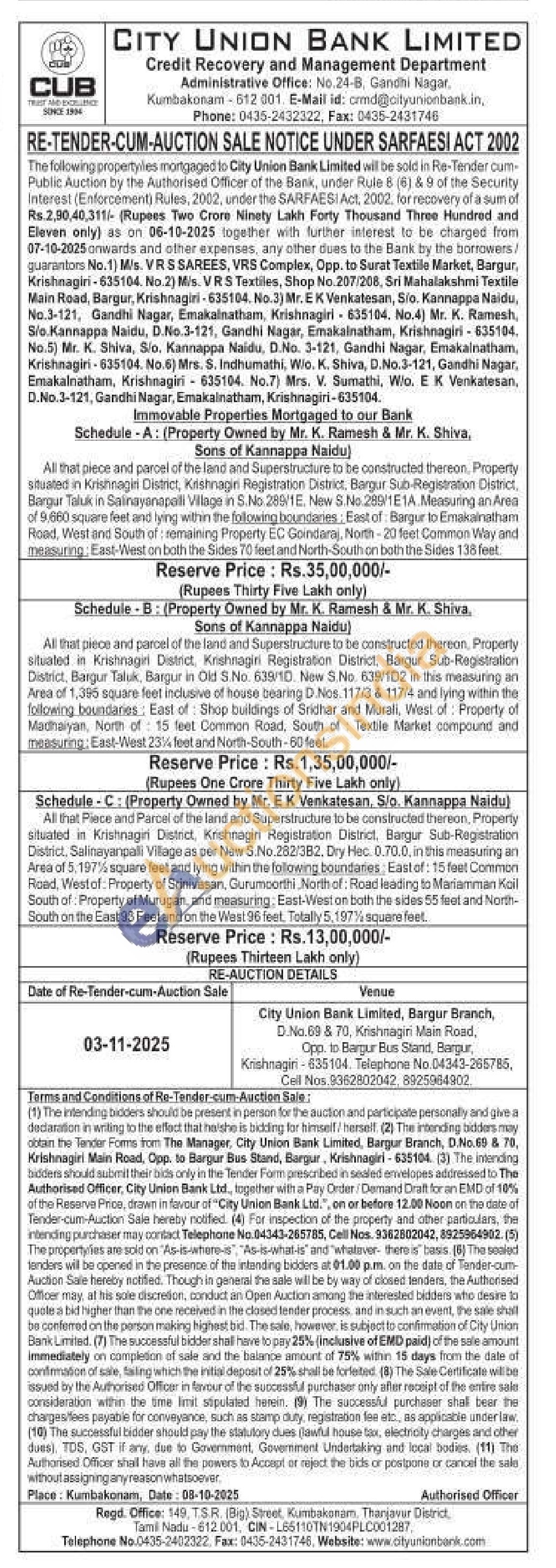 Contact Telephone No.04343-265785, Cell Nos 9362802042, 8925964902