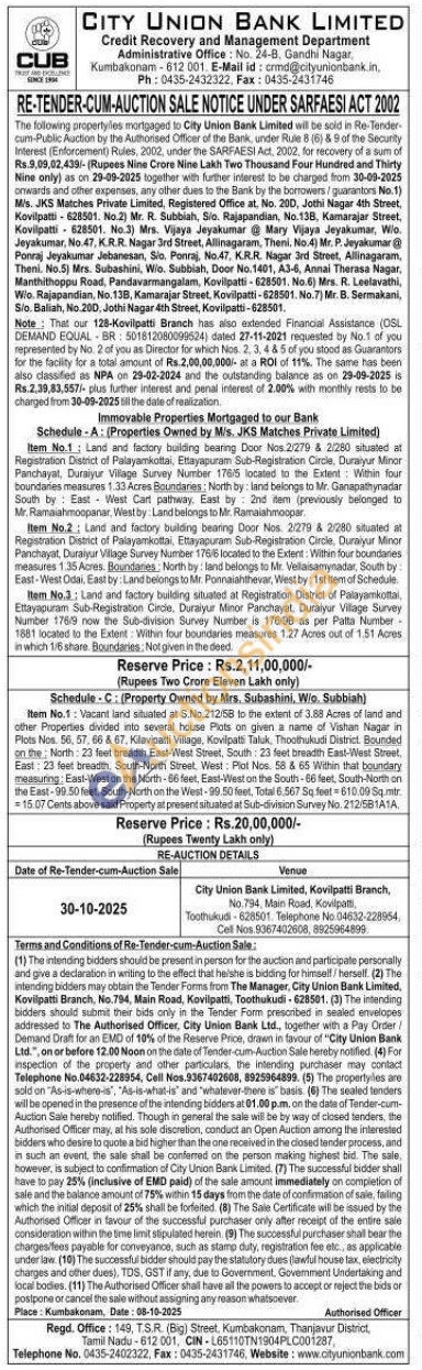 Item No.1: Land and factory building bearing Door Nos 2/279 & 2/280 situated at Registration District of Palayamkottai, Ettayapuram Sub-Registration Circle, Duraiyur Minor Panchayat, Duraiyur Village Survey Number 176/5 located to the Extent: Within four boundaries measures 1.33 Acres Boundaries: North by land belongs to Mr. Ganapathynadar South by East West Cart pathway. East by 2nd item (previously belonged to Mr. Ramaiahmoopanar, West by: Land belongs to Mr. Ramaiahmoopar Item No.2: Land and factory building bearing Door Nos. 2/279 & 2/280 situated at Registration District of Palayamkottai, Ettayapuram Sub-Registration Circle, Duraiyur Minor Panchayat, Duraiyur Village Survey Number 176/6 located to the Extent. Within four boundaries measures 1.35 Acres. Boundaries: North by land belongs to Mr. Vellaisamynadar, South by East-West Odai, East by: Land belongs to Mr. Ponnaiahthevar, West by: 1st Item of Schedule. Item No.3.; Land and factory building situated at Registration District of Palayamkottai, Ettayapuram Sub-Registration Circle, Duraiyur Minor Panchayat. Duraiyur Village Survey Number 176/9 now the Sub-division Survey Number is 176/98 as per Patta Number 1881 located to the Extent: Within four boundaries measures 1.27 Acres out of 1.51 Acres in which 1/6 share. Boundaries: Not given in the deed