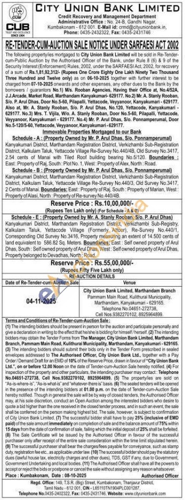 2) Kanyakumari District, Marthandam Registration District, Verkizhambi Sub-Registry, Kalkulam Taluk, Yettacode Village (Formerly Attoor), Re-Survey No.440/1, Corresponding Old Survey No.3416, Property measuring an extent of 14.500 cents of land equivalent to 586.82 Sq. Meters. Boundaries: East: Self owned property of Arul Dhas, South: Self owned property of Arul Dhas, West: Self owned property of Arul Dhas, Property belonged to Devadhas, North: Road.
