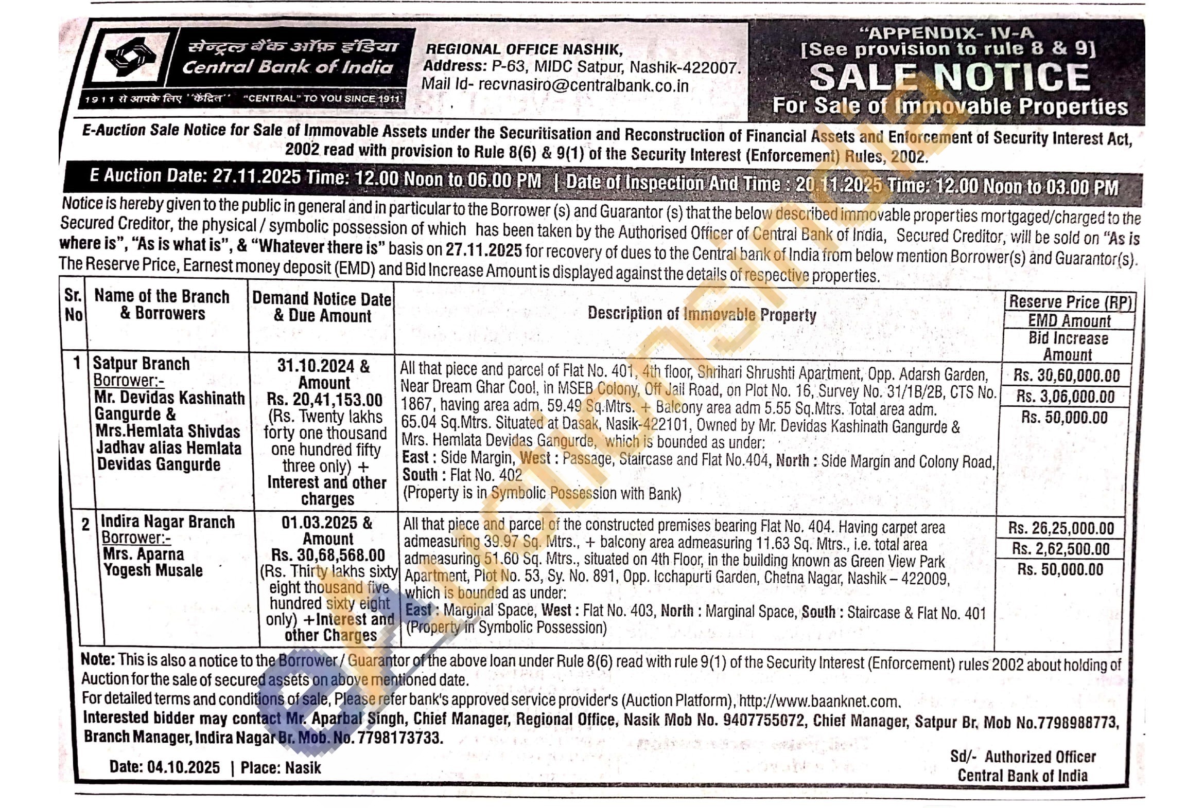 contact Mr. Aparbal Singh, Chief Manager, Regional Office, Nasik Mob No. 9407755072, Chief Manager, Satpur Br. Mob No.7798988773, Branch Manager, Indira Nagar Br. Mob. No. 7798173733