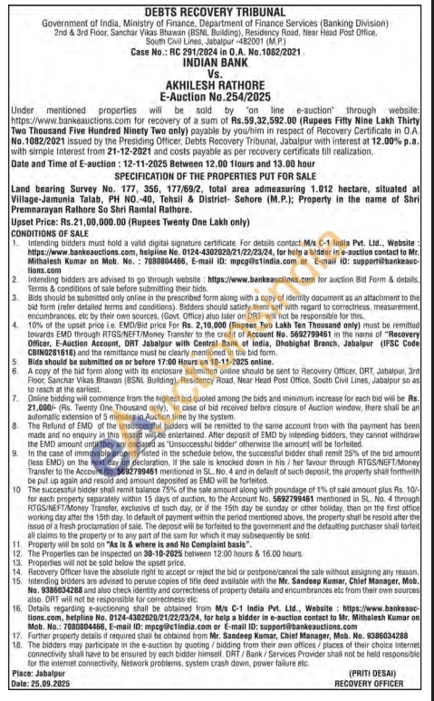 SPECIFICATION OF THE PROPERTIES PUT FOR SALE : Land bearing Survey No. 177, 356, 177/69/2, total area admeasuring 1.012 hectare, situated at Village-Jamunia Talab, PH NO.-40, Tehsil & District- Sehore (M.P.); Property in the name of Shri Premnarayan Rathore So Shri Ramlal Rathore
