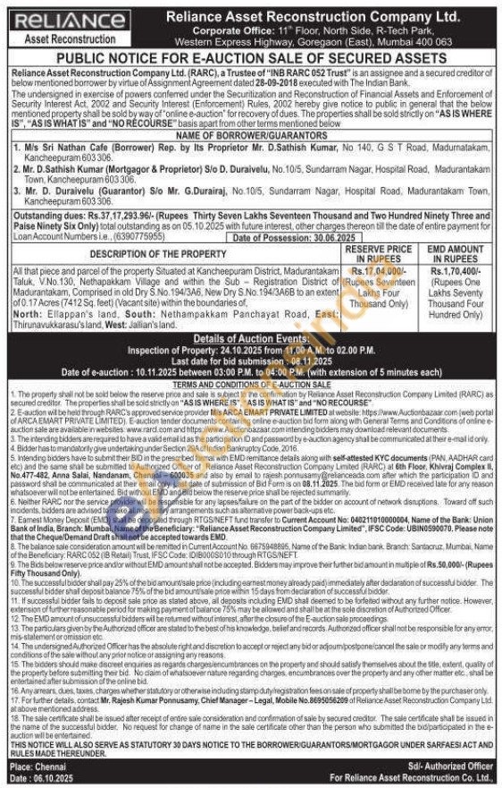 All that piece and parcel of the property Situated at Kancheepuram District, Madurantakam Taluk, V.No.130, Nethapakkam Village and within the Sub Registration District of Madurantakam, Comprised in old Dry S.No. 194/3A6, New Dry S.No. 194/3A6B to an extent of 0.17 Acres (7412Sq. feet) (Vacant site) within the boundaries of,North: Ellappan's land, South: Nethampakkam Panchayat Road, East:Thirunavukkarasu's land, West: Jallian's land.