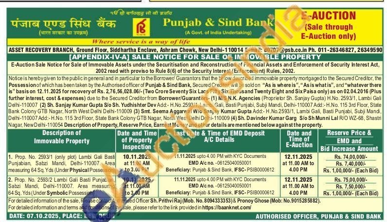 1. Prop. No. 2593/1 (only plot) Lambi Gali Basti Punjabian, Sabzi Mandi, Delhi-110007. Area measuring 64 Sq. Yds (Under Physical Possession)
