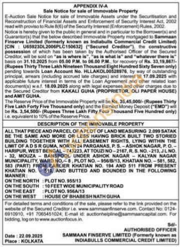 ALL THAT PIECE AND PARCEL OF A PLOT OF LAND MEASURING 2.099 SATAK BE THE SAME AND MORE OR LESS HAVING BRICK BUILT TWO STORIED BUILDING TOGETHER WITH ALL EASEMENT RIGHTS, LYING WITHIN THE LIMIT OF ADSR GUMA, NORTH 24 PARGANAS, P. S.-ASHOK NAGAR, P. O.-HARIPUR, WEST BENGAL-743223, AT TOUZI NO-2167, R. S. NO. 213, JL NO. 32, MOUZA BANSPOOL UNDER ASHOK NAGAR KALYAN NAGAR MUNICIPALITY, WARD NO.-8, PLOT NO.956/Β/13, KHATIAN NO.-581,582, 583 (PART) FROM EARLIER KHATIAN NO. 194 AND 511 FROM PRESENT KHATIAN NO.510, AND BUTTED AND BOUNDED IN THE FOLLOWING MANNER: ON THE NORTH PLOT NO. 955/13 ON THE SOUTH 10 FEET WIDE MUNICIPALITY ROAD ON THE EAST PLOT NO. 956A/13 ON THE WEST HOUSE OF BHABESH NATH GUHA
