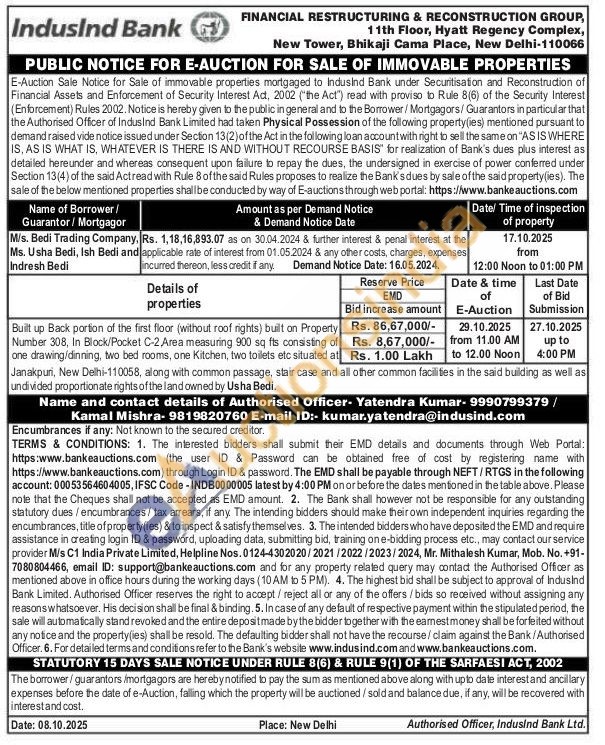 Built up Back portion of the first floor (without roof rights) built on Property Number 308, In Block/Pocket C-2 Area measuring 900 sq fts consisting of one drawing/dinning, two bed rooms, one Kitchen, two toilets etc situated at Janakpuri, New Delhi-110058, along with common passage, stair case and all other common facilities in the said building as well asundivided proportionate rights of the land owned by Usha Bedi.