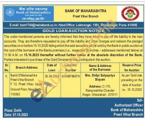 Bank of Maharashtra Gold Auctions Auction in New Delhi