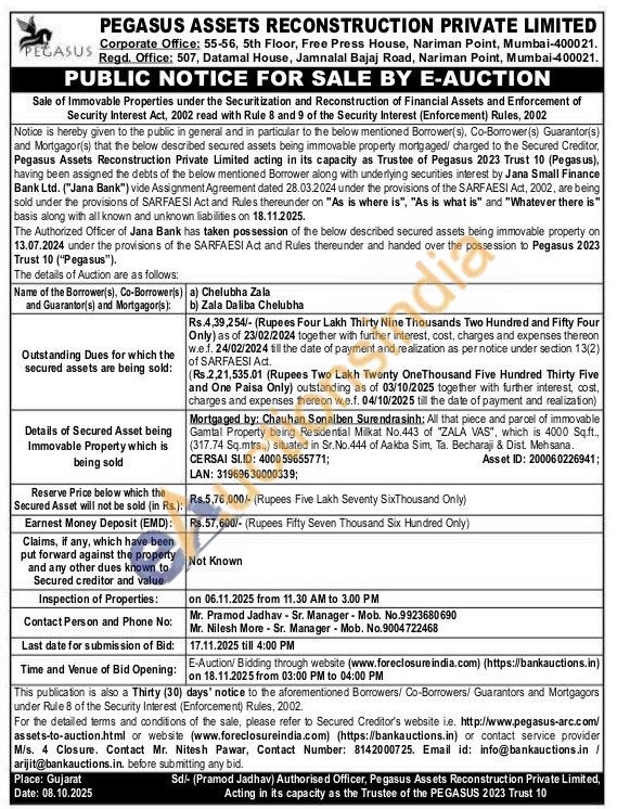 All that piece and parcel of immovable Gamtal Property being Residential Milkat No.443 of "ZALA VAS", which is 4000 Sq.ft., (317.74 Sq.mtrs..) situated in Sr. No. 444 of Aakba Sim, Ta. Becharaji & Dist. Mehsana