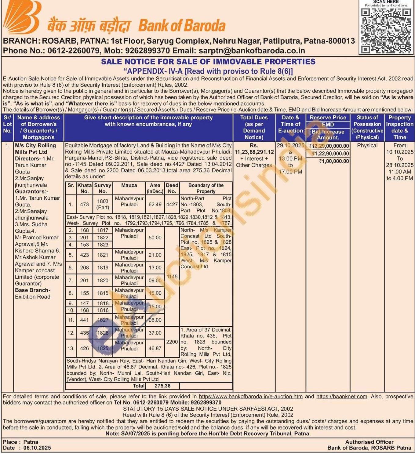 Equitable Mortgage of factory Land & Building in the Name of M/s City Rolling Mills Private Limited situated at Mauza-Mahadevpur Phuladi, Pargana-Maner, P.S-Bihta, District-Patna, vide registered sale deed no.-1145 Dated 09.02.2011, Sale deed no.4427 Dated 13.04.2012 & Sale deed no.2200 Dated 06.03.2013.total area 275.36