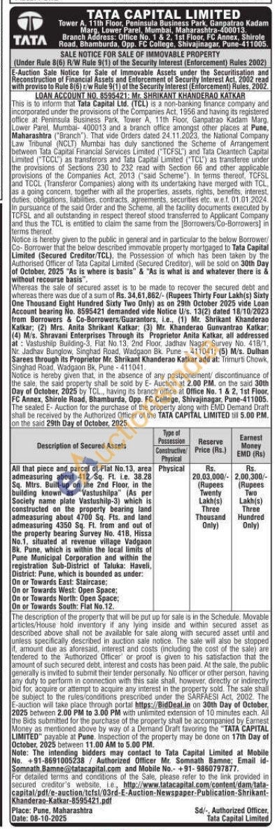 All that piece and parcel of Flat No.13, area admeasuring about 412 Sq. Ft. i.e. 38.28 Sq. Mtrs. Built-up on the 2nd Floor, in the building known as "Vastushilpa" (As per Society name plate Vastushilp-3) which is constructed on the property bearing land admeasuring about 4700 Sq. Fts. and land admeasuring 4350 Sq. Ft. from and out of the property bearing Survey No. 41B, Hissa No.1, situated at revenue village Vadgaon Bk. Pune, which is within the local limits of Pune Municipal Corporation and within the registration Sub-District of Taluka: Haveli, District: Pune, which is bounded as under: On or Towards East: Staircase; On or Towards West: Open Space: On or Towards North: Open Space; On or Towards South: Flat No.12