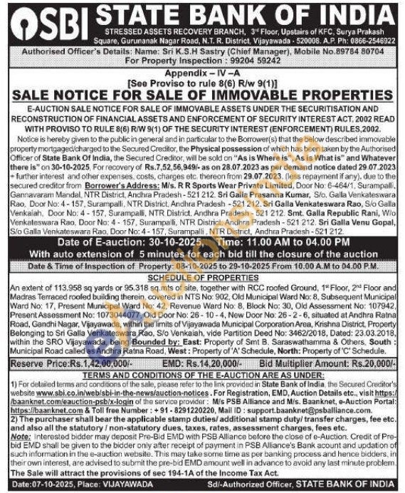 SCHEDULE OF PROPERTIES : An extent of 113.958 sq yards or 95.318 sq.mts of site, together with RCC roofed Ground, 1 Floor, 2nd Floor and Madras Terraced rooled building therein, covered in NTS No: 902, Old Municipal Ward No: 8, Subsequent Municipal Ward No: 17, Present Municipal Ward No: 42, Revenue Ward No: 8, Block No: 30, Old Assessment No: 107942, Present Assessment No: 1073044077, Old Door No: 26-10-4, New Door No: 26-2-6, situated at Andhra Ratna Road, Gandhi Nagar, Vijayawada, within the limits of Vijayawada Municipal Corporation Area, Krishna District, Property Belonging to Sri Galla Venkateswara Rao, S/o Venkaiah, vide Partition Deed No: 3462/2018, Dated: 23.03.2018, within the SRO Vijayawada, being Bounded by: East: Property of Smt B. Saraswathamma & Others, South: Municipal Road called as Andhra Ratna Road, West: Property of 'A' Schedule, North: Property of 'C' Schedule
