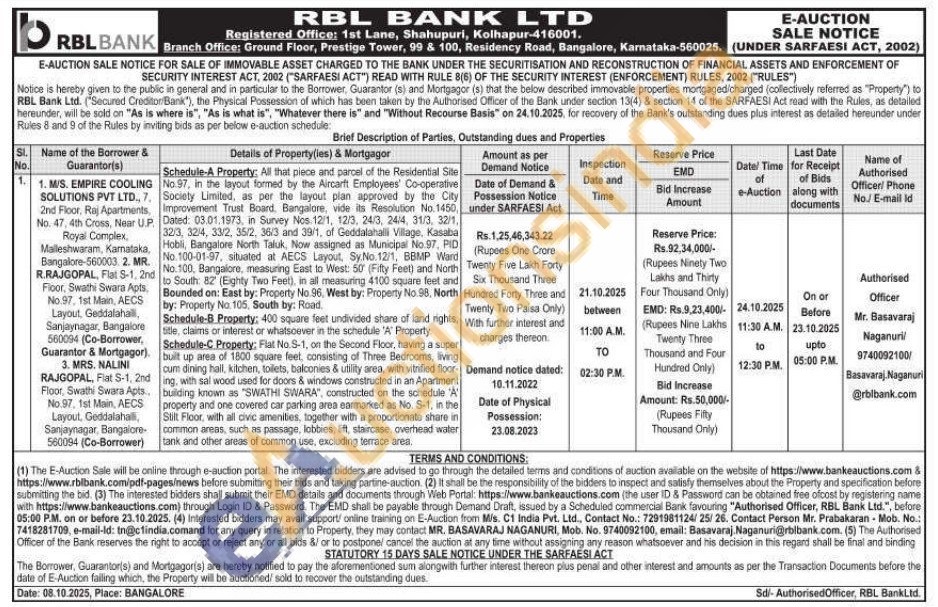 Schedule-A Property: All that piece and parcel of the Residential Site No.97, in the layout formed by the Aircarft Employees' Co-operative Society Limited, as per the layout plan approved by the City Improvement Trust Board Bangalore, vide its Resolution No. 1450, Dated: 03.01.1973, in Survey Nos 12/1, 12/3, 24/3, 24/4, 31/3, 32/1, 32/3, 32/4, 33/2, 35/2, 36/3 and 39/1, of Geddalahalli Village, Kasaba Hobli, Bangalore North Taluk, Now assigned as Municipal No.97, PID No.100-01-97, situated at AECS Layout, Sy. No. 12/1, BBMP Ward No.100, Bangalore, measuring East to West: 50 (Fifty Feet) and North to South: 82 (Eighty Two Feet), in all measuring 4100 square feet and Bounded on: East by: Property No.96. West by: Property No. 98. North by: Property No 105, South by: Road Schedule-B Property: 400 square feet undivided share of land rights. title, claims or interest or whatsoever in the schedule 'A' Property.