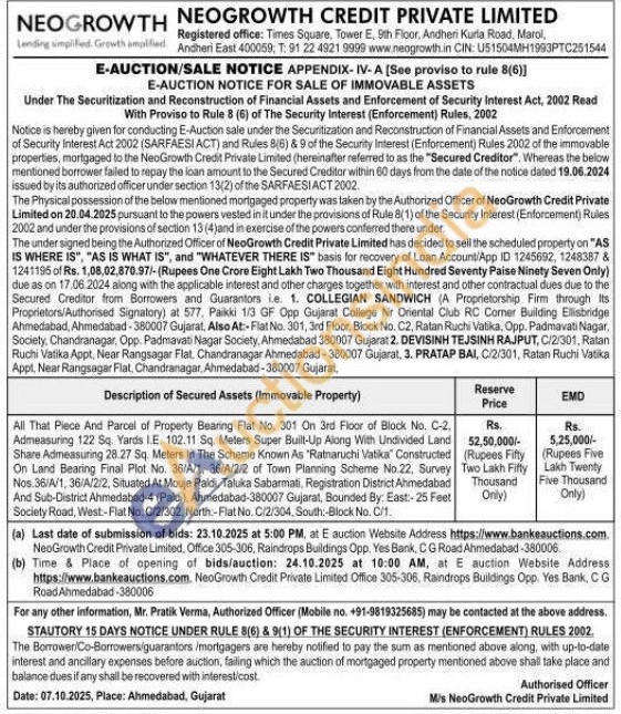 All That Piece And Parcel of Property Bearing Flat No. 301 On 3rd Floor of Block No. C-2. Admeasuring 122 Sq. Yards I.E. 102.11 Sq. Meters Super Built-Up Along With Undivided Land Share Admeasuring 28.27 Sq. Meters In The Scheme Known As "Ratnaruchi Vatika" Constructed On Land Bearing Final Plot No. 36/A/1, 36/A/2/2 of Town Planning Scheme No.22, Survey Nos 36/A/1, 36/A/2/2, Situated At Mouje Paidi, Taluka Sabarmati, Registration District Ahmedabad And Sub-District Ahmedabad-4 (Paldi), Ahmedabad-380007 Gujarat, Bounded By: East:- 25 Feet Society Road, West-Flat No. C/2/302, North-Flat No. C/2/304, South:-Block No. C/1
