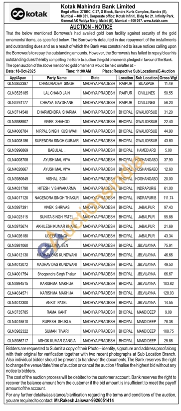 Kotak Mahindra Bank Gold Auctions Auction in Raipur