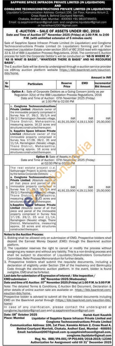 a. Conglome Technoconstructions Private Limited: (Absolute owner of the immovable property comprised in Survey Nos 17, 39/2, 35/1/A and 39/2/1 Ranishigaon (Nevale) village, Thane District. Maharashtra. measuring approx. 16.22 acres and structures constructed thereupon.