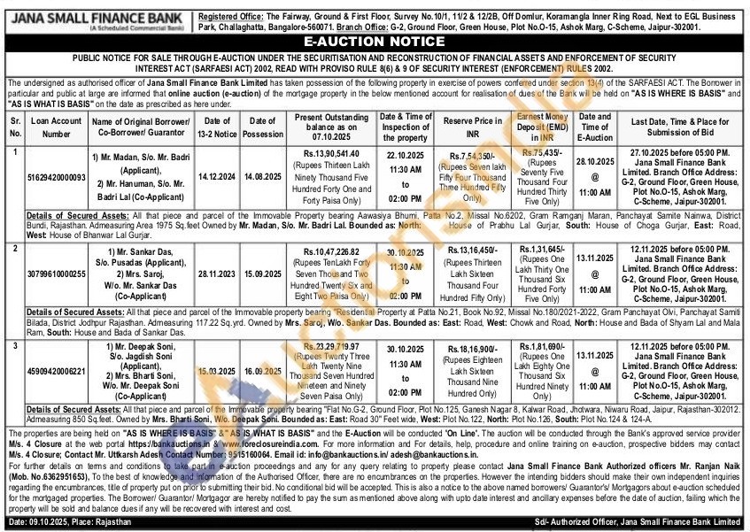 Property bearing Aawasiya Bhumi, Patta No.2, Missal No.6202, Gram Ramganj Maran, Panchayat Samite Nainwa, District House of Prabhu Lal Gurjar, South: House of Choga Gurjar, East: Road, Details of Secured Assets: All that piece and parcel of the Immovable Bundi, Rajasthan. Admeasuring Area 1975 Sq. leet Owned by Mr. Madan, S/o. Mr. Badri Lal. Bounded as: North: West House of Bhanwar Lal Gurjar.