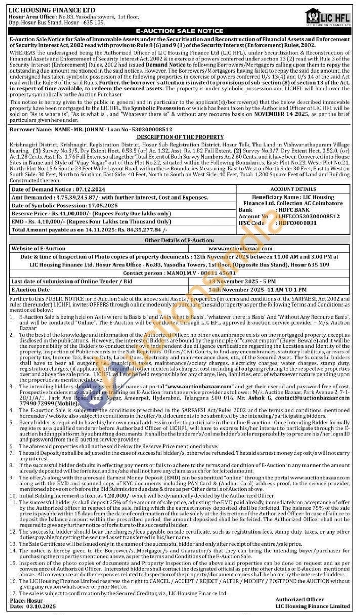 DESCRIPTION OF THE PROPERTY : Krishnagiri District, Krishnagiri Registration District, Hosur Sub Registration District, Hosur Talk, The Land in Vishwanathapuram Village bearing, (1) Survey No.3/5, Dry Extent Hect. 0.53.5 (or) Ac. 1.32, Asst. Rs. 1.82 Full Extent. (2) Survey No.3/7, Dry Extent Hect. 0.52.0, (or) Ac.1.28 Cents, Asst. Rs. 1.76 Full Extent so altogether Total Extent of Both Survey Numbers Ac.2.60 Cents, and it have been Converted into House Sites in Name and Style of "Vijay Nagar" out of this Plot No.22, situated within the Following Boundaries, East: Plot No.23, West: Plot No.21, North: Plot No. 15 & South: 23 Feet Wide Layout Road, within these Boundaries Measuring: East to West on North Side: 30 Feet, East to West on South Side: 30 Feet, North to South on East Side: 40 Feet, North to South on West Side: 40 Feet, Total: 1,200 Square Feet of Land and Building Constructed thereon